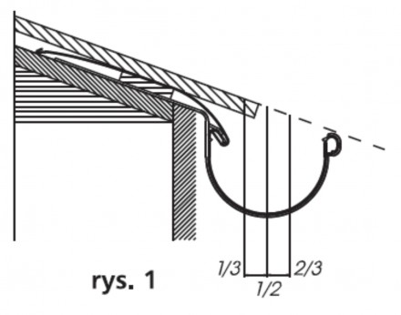 Montaż uchwytów rynnowych różni się w zależności od konstrukcji dachu i rodzaju zastosowanych uchwytów. Uchwyty proste mocujemy bezpośrednio do krokwi lub deski okapowej, uchwyty doczołowe – do deski czołowej. W tym drugim przypadku do ustawienia właściwego spadku w kierunku leja używa się najczęściej sznurka rozpiętego między pierwszym, a ostatnim uchwytem. W przypadku uchwytów stalowych prostych należy wyznaczyć miejsca gięcia kolejnych uchwytów, pamiętając aby przednia część uchwytu była niżej od jego tylnej części o ok. 10 mm. Rozstaw uchwytów rynny determinuje kilka czynników: sztywność profilu, rodzaj materiału pokryciowego, panujące warunki klimatyczne i wreszcie konstrukcja okapu. Zaleca się montaż uchwytów w odstępach max. 70 cm, natomiast w rejonach o obfitych opadach śniegu odległość tę zaleca się zmniejszyć do 50 cm, jak również należy pamiętać o instalacji płotków przeciwśnieżnych – samo obciążenie śniegiem nie jest niebezpieczne, groźniejsze są zsuwające się z dachu bryły lodowe, które przy niewłaściwym montażu rynny spadając mogą uszkodzić profil. W tym miejscu należy wrócić do kwestii instalacji rynny na odpowiedniej wysokości w stosunku do połaci dachu - rynny nie powinny wystawać poza płaszczyznę, która stanowi przedłużenie dachu, wychodząc poza zakończenie połaci dachowej mniej więcej połową swojej szerokości, w taki sposób, aby spływająca woda zawsze trafiała do rynny (rys.1).